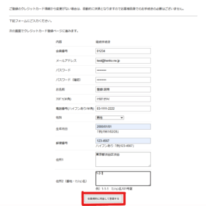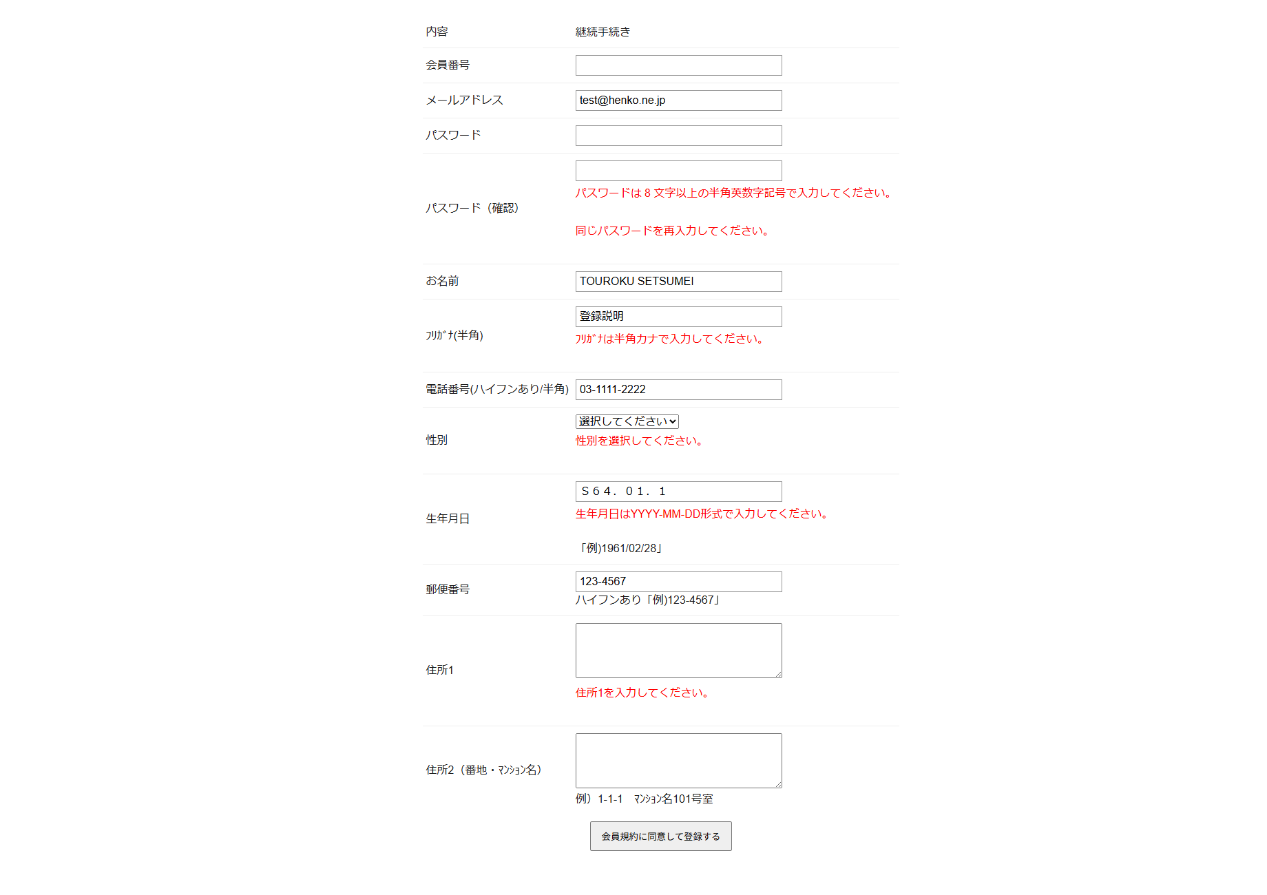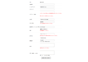 エラーがある場合は赤文字でエラーが表示されますので、エラーを解消して再度「会員規約に同意して登録する」ボタンを選択してください。